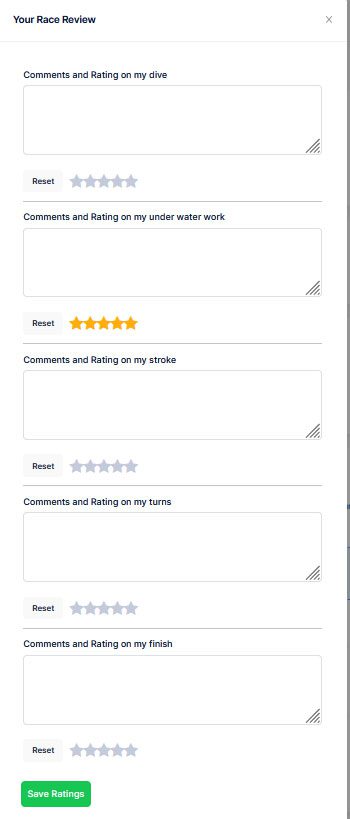 Against each race that is entered into Trackaswim, you are able to do a full review. From the Race Analysis page, click on the ‘Add/Edit Review’ button. A new scree will appear with the ability to add reviews for the following aspects of your race:-