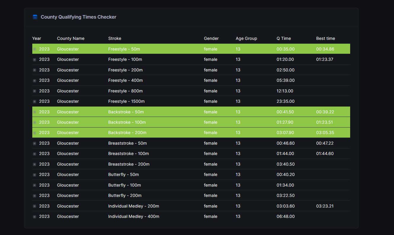 For UK swimmers, Trackaswim automatically checks your times against the current county qualifying standards for your region. To use this feature, you must be signed up with a club and have participated in fully licensed events. This automation makes it easy to track your qualifying times, providing a comprehensive overview of your progress across all races, not just one at a time. This feature ensures you always know where you stand with your current times and helps you stay on top of your goals.