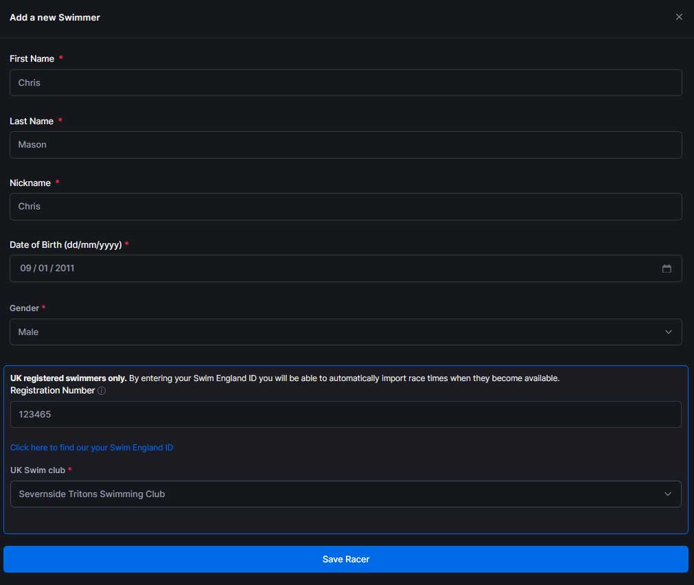If you filled in the ‘Registration Number’ during your swimmer setup then you will no longer have access to edit this field. This ID never changes during your time swimming with Swim England. If you have entered this field incorrectly, you will need to delete the swimmer and set them up again with the correct registration code.