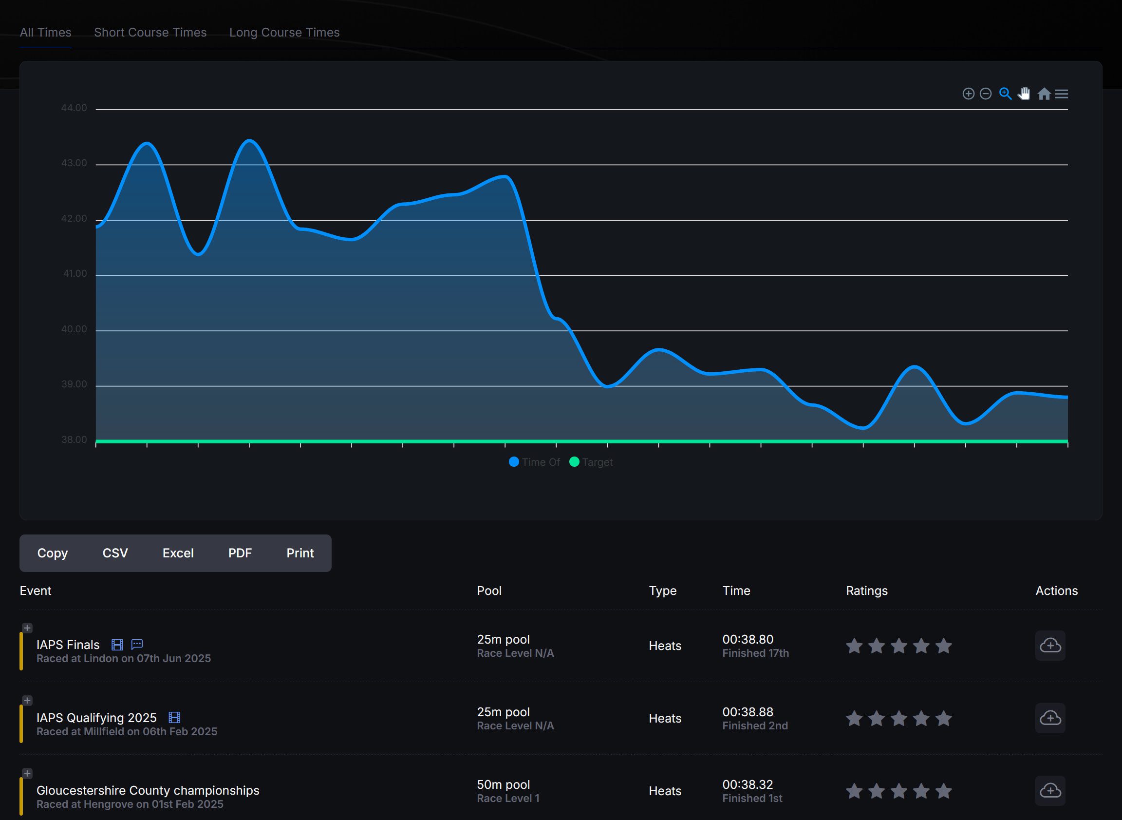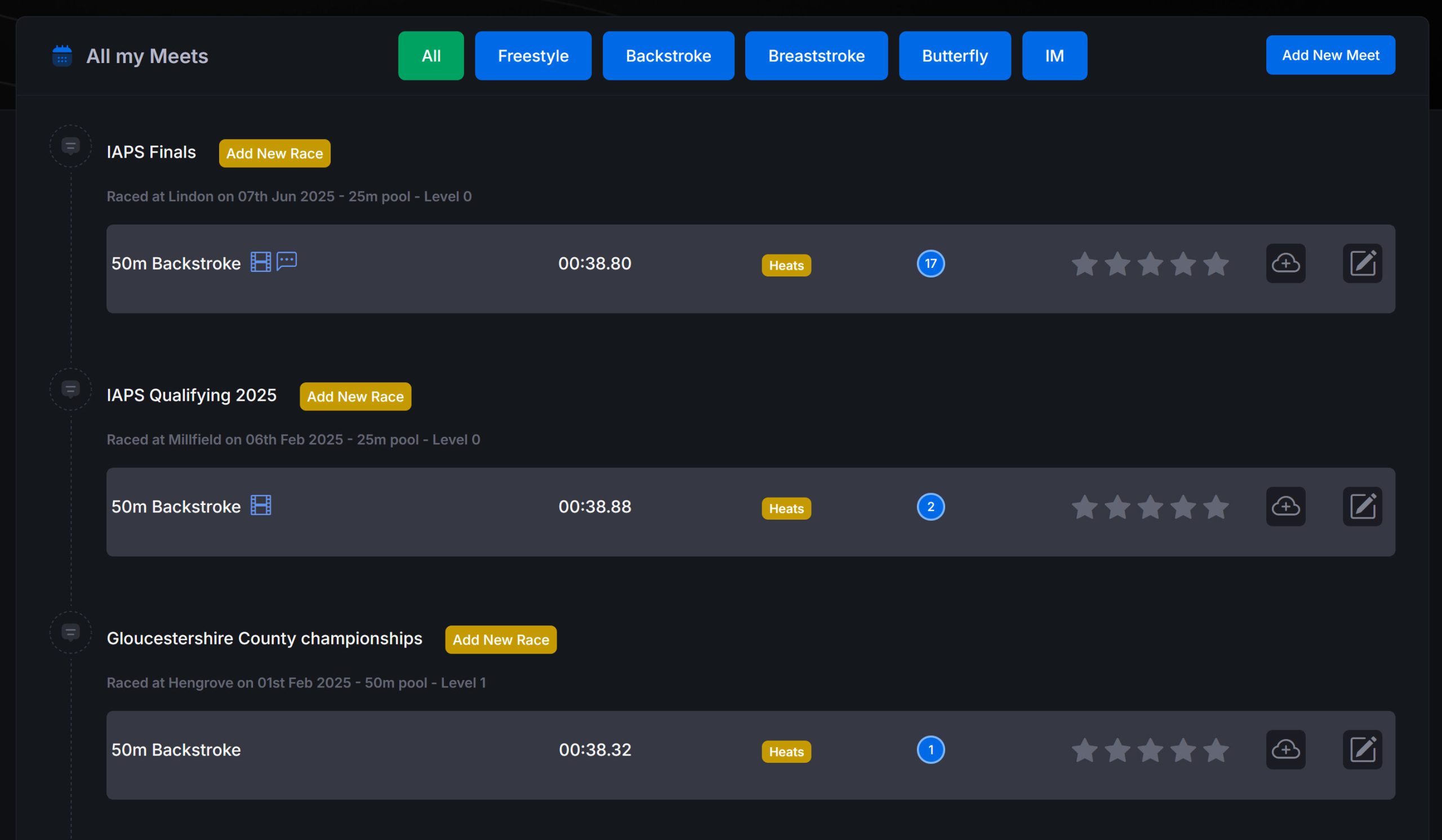 Race meets are what provide Trackaswim with the data needed to do the advanced analysis. Each race swam provides the data needed to analyse the strokes, analyse any improvements in personal bests. It allows our system to check your times against the county requirements for qualifications. It allows you to review your race performance and with your coach, identify areas of your swim that require focus in training before your next meet.